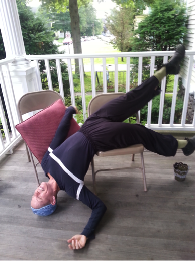 Watching Dancing in the Moment, an improvisation concert scored by Angie Hauser and Chris Aiken, with the festival musicians in full force. Watching dress rehearsal of Different Voices, with alumnus Paul Matteson with partner Jennifer Nugent perform a duet by Wendy Woodson, and alumna Ellen Smith Ahern (full-bodied pregnant) with Lida Winfield in their co-created duet. They are all intelligent, inspiring movers. Watching David Dorfman challenge the students with off-center technique: “The play between vertical and not,” and Chris Aiken guide improvisation, encouraging sustaining a “local and global view” of the moving moment. Yin Mei and I converse about contemplative dance and plot future connections, and then I have an early morning departure, with Jennifer willing to engage a quick chair improvisation for a photo.