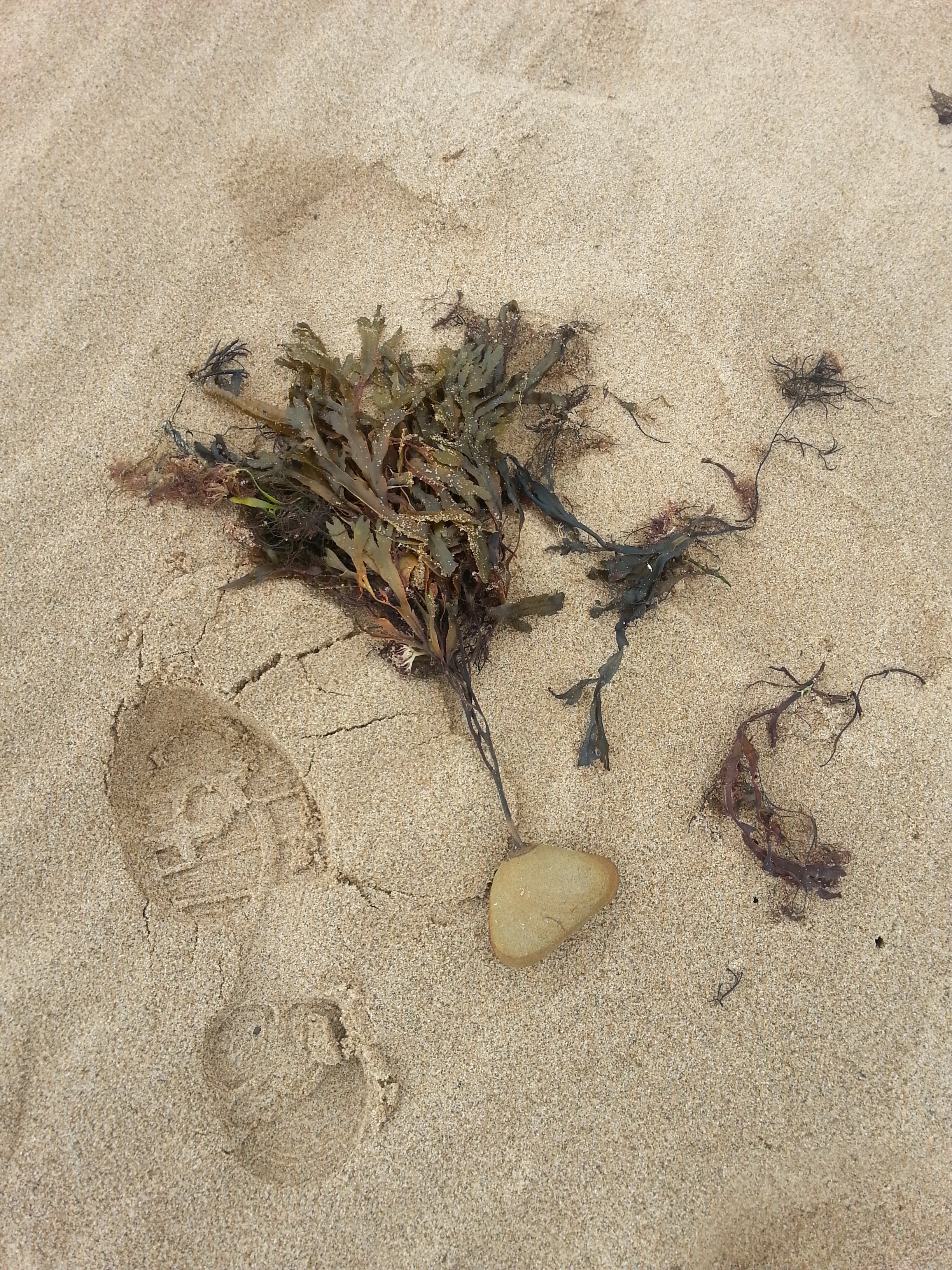 Midweek we travel to la plage du Magouëro, a long stretch of sandy beach. Voilà! Furbelows (Laminaria bulbosa), the local giants of ocean kelp, are strewn along the frontier of salty edge—their boot-sized holdfasts, frilly stipes (named for women’s ruffled petticoats), and broad-fingered blades identify them in my British field guide. Sloughed-off from sea depths, they offer new life on shore—becoming one with air, merging with sand, and knowing the beaks of birds.
