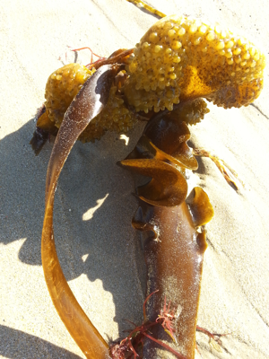 There is a warning on eating mussels, and I remember as I move through the traces of bubbles lingering along the wrack line, that I should wash my hands. Seaweed artist Josie Iselin taught me about watching for high bacteria count on certain beaches. I notice a few student surfers in bathing suits immerse themselves along with wet-suit clad companions. This is my dance: between joy (“yes” to southern California warmth) and despair (“no” to sacrificing healthy ecosystems for oil). I choose joy, recognizing impermanence.