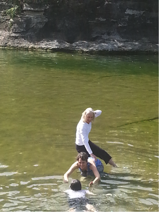 Susan Prins and I met in l982, my first year of teaching at Middlebury, and a good reason to be there. She danced in four Dance Company of Middlebury tours (two in New England, plus Washington D.C. and San Francisco) as well as disappearing for a year and a half in Taiwan to do a research project with Cloud Gate Dance Theatre. This was my first thesis with the East Asian Studies Department, and I learned much about research/grading and the dialogue between embodied experience and language. Our connection has been fundamental to my growth as a teacher, my understanding as an artist, and my life as a woman among women and the choices to be made in a life. Later Susan performed with Ushio Amagatsu (see Place of Dance p. 186) in Japan, and developed an arts center in Chiapas, Mexico with Alonso Mendez. There’s too much history to relate, but here we are again—dancing together with her son Maxam at Barton Springs in central Austin, Texas and refreshing our connections. Susan now works as a massage therapist, holds deep knowledge about intercultural communication, and supports the magic, mystery, and edge of living/dancing ethically. What a treat! Dancing in her place, in water, and in the lovely studio of her colleague Beverly Bajema. They are hosting a weekly Place of Dance study group in Austin throughout the next year!