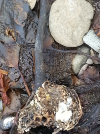 In Whale Cove where we are staying, I dance with four nearby harbor seals. Square faced with noses pointed to the sky, they seem unconcerned by my presence as I traipse up and down the sandy beach touching various types of seaweed. With both wrack and kelp, all the colors are present: bright greens, reds, and browns. Just the sloughed-off blades or stipes from long-stemmed kelp are present, blown in from deeper waters. Amid the various types of wrack, a few have holdfasts still clinging to rocky footholds. Scale: if you get up-close and friendly, each one is a mountainscape.